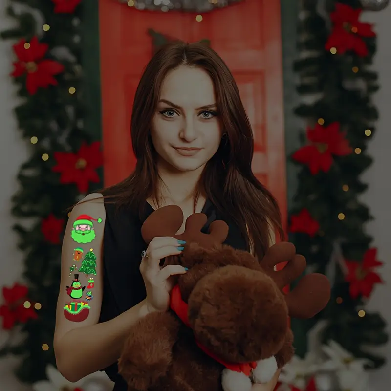 10 Sheets Cute Different Style Night Fluorescent Holiday Tattoos Stickers Pattern For Kids Boys Girls Women Men. Add Some Elements Of Interest Santa Claus,Christmas Tree,Reindeer,Socks,Snowman,Bell,Sleigh To Christmas Costume. Be unique to the party and help your kids share these Christmas tattoos with their friends.